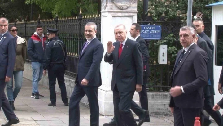 Yunanistan'a resmi ziyaret gerçekleştiren Cumhurbaşkanı Recep Tayyip Erdoğan, temaslarını sürdürüyor. Erdoğan, Yunanistan Cumhurbaşkanı Katerina Sakellaropoulou ile görüşmesinin ardından Yunanistan Başbakanı Kyriakos Miçotakis ile görüşeceği başbakanlık binasına geçtiği sırada kendisine Türkçe seslenen Yunan gazeteciye selam verdi. Cumhurbaşkanı Erdoğan, 'Hoş geldiniz' diyen gazeteci Manolis Kostidis'e 'Hoş bulduk, nasılsınız' şeklinde cevap verdi. Erdoğan, kısa süreli konuşmanın ardından Kostidis'i eliyle selamlayarak yürümeye devam etti.