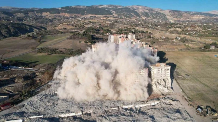 Kahramanmaraş merkezli meydana gelen depremler sonrasında ağır hasar raporu verilen binalarda dinamit ile kontrollü yıkım sürüyor.