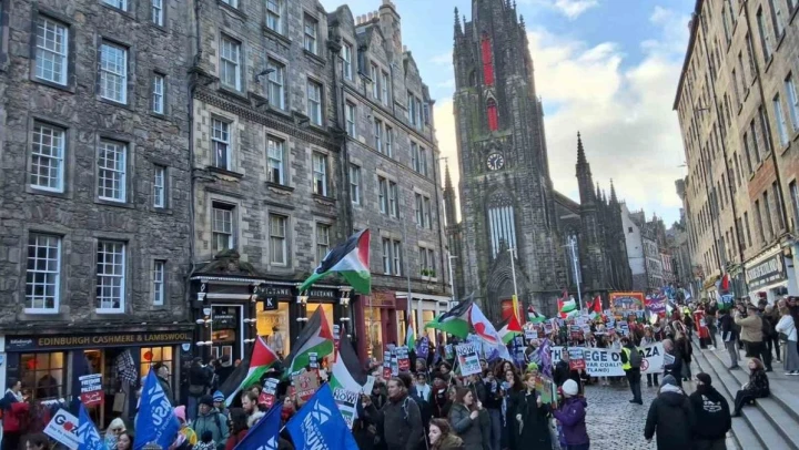 İskoçya'nın başkenti Edinburgh'ta düzenlenen Filistin'e destek yürüyüşünde Gazze Şeridi'ne yönelik saldırılarını sürdüren İsrail'e tepki gösteren binlerce kişi, 'Özgür Filistin' sloganları attı.