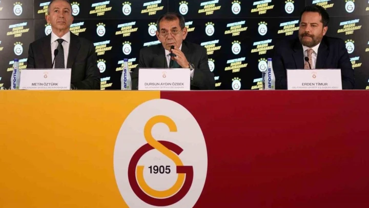 Galatasaray Başkanı Dursun Aydın Özbek, İkinci Başkan Metin Öztürk ve Sportif A.Ş. Başkan Vekili Erden Timur, Ali Sami Yen Spor Kompleksi RAMS Park'ta gündeme dair yapacağı basın toplantısını düzenledi. Toplantının yapıldığı salondaki barkovizyonda, 'Kenetlenin başka Galatasaray yok' görseli yer aldı.