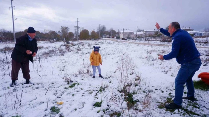 Edirne'nin rakımı yüksek köylerinde etkili olan kar yağışı kartpostallık görüntüler oluştururken, köyde yaşayan vatandaşlar ise kartopu oynayarak doyasıya eğlendi.
