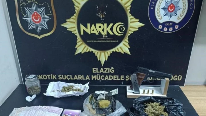 Elazığ Cumhuriyet Başsavcılığı koordinesinde İl Emniyet Müdürlüğü Narkotik Suçlarla Mücadele Şube Müdürlüğü tarafından uyuşturucu ile mücadele çerçevesinde sokak satıcılarına yönelik çalışma gerçekleştirildi. Yapılan çalışmalarda, B.Y. (20) isimli şahsın uyuşturucu madde temin ettiğinin tespit edilmesi üzerine üst aramasında ve Nina isimli narkotik köpeği ile yapılan ikamet aramasında 10 parça halinde toplam 505,35 gram esrar maddesi, 1 adet sentetik ecza, 1 adet ruhsatsız tabanca ve tabancaya ait 2 adet fişek ele geçirildi.