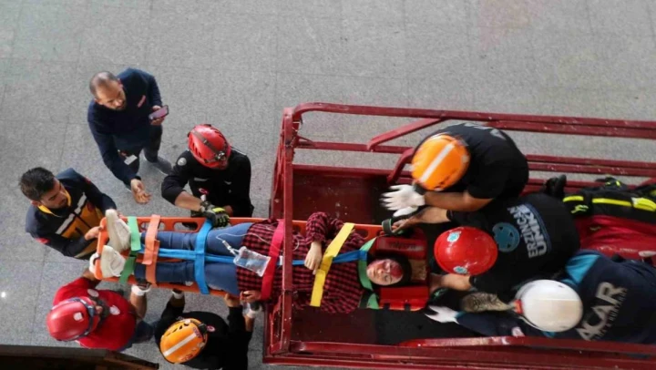 DHMİ Erzincan Yıldırım Akbulut Havalimanı'nda acil durum planı kapsamında AFAD koordinasyonunda deprem tatbikatı gerçekleştirildi. Ekipler, senaryo gereği depremde yaralananlara ve sonrasında çıkan yangına kısa sürede müdahale etti.