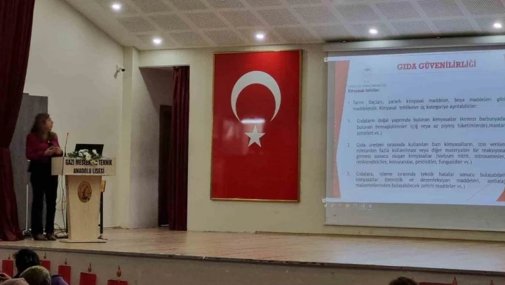 Gazi Mesleki Teknik ve Anadolu Lisesi toplantı salonunda 25 Kasım cumartesi günü düzenlenen eğitimde İl Tarım ve Orman Müdürlüğünde görevli Gıda Mühendisi Zuhal Ünal Canbaz ve Veteriner Hekim Hatice Olcay, yönetmelik kapsamında hammaddenin kabulünden öğrencilere sunulmasına kadar geçen aşamalarda uyulması gereken kuralları anlattı. Ayrıca gıda işletmelerine ait özel hijyen gereklilikleri, personel hijyeni, işletme hijyeni, gıda maddelerinin depolama ve muhafazası, gıdaların hazırlanması ve işlenmesi, kantin çalışanlarının uyması gereken hijyen kuralları, gıdalarda bulunması muhtemel tehlikeler, gıdanın bozulması ve bozulma sebepleri, gıda kaynaklı enfeksiyon ve zehirlenmeler ile ilk yardım eğitimi konularında sunum eşliğinde kapsamlı bilgilendirmelerde bulunuldu.