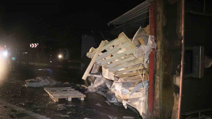 Fayans yüklü tırın devrildiği kazada karayolu tek yönlü trafiğe kapandı