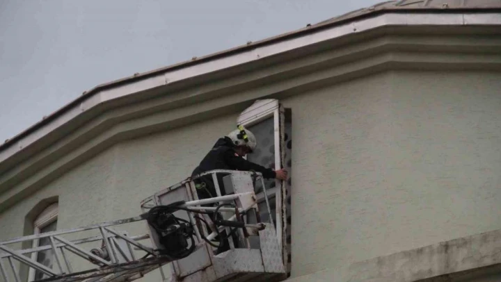 Antalya'da caminin kubbesinde şiddetli rüzgar nedeniyle tehlike oluşturan pencereyi itfaiye ekipleri merdiven ile ulaşarak söktü.