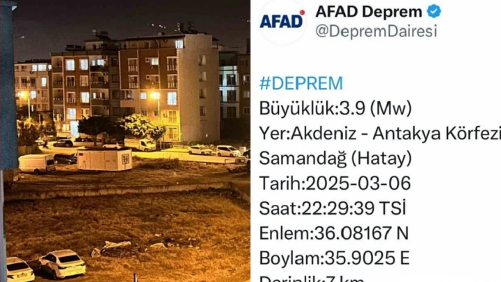 AFAD verilerine göre, saat 22.29'da Akdeniz açıklarında 3.9 büyüklüğünde deprem meydana geldi. Hatay il genelinde hissedilen deprem vatandaşları tedirgin etti. Alınan ilk belirlemelere göre kent genelinde olumsuz durum olmadığı öğrenildi.