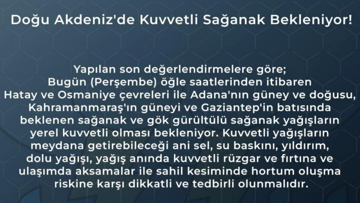 Hatay Meteoroloji Müdürlüğü'nden yapılan açıklamada Hatay'da kuvvetli, yer yer çok kuvvetli ve gök gürültülü sağanak yağış beklenildiği bildirildi.
