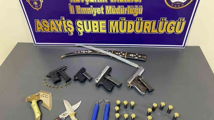 Nevşehir Emniyet Müdürlüğünden yapılan açıklamaya göre, geçtiğimiz gün meydana gelen iş yeri ve otomobil kurşunlama ve kasten yaralama olayına karışan 10 şüphelilerin yakalanması için Asayiş Şube Müdürlüğü ekipleri çalışma başlatıldı. Kimlikleri tespit edilen 10 şüphelinin yakalanması için yapılan operasyonda 1 adet ruhsatsız tabanca, 3 adet kuru sıkı tabanca, 3 adet av tüfeği fişeği, 18 adet ses fişeği, 2 adet bıçak, 1 adet mumçaka tabir edilen zincirli sopa, 1 adet delikli balta, 1 adet kılıç tabir edilen kesici alet ele geçirildi.