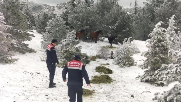 Manisa İl Jandarma Komutanlığı Çevre, Doğa ve Hayvanları Koruma Tim Komutanlığınca Manisa Spil Dağı Milli Parkında sert geçen kış şartlarından etkilenen yılkı atlarının yaşam alanlarına yem bırakılarak beslenmelerine katkı sağlandı.