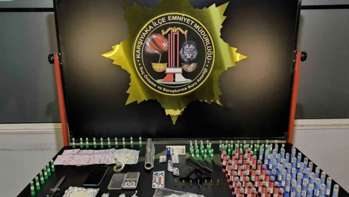 Karşıyaka İlçe Emniyet Müdürlüğü ekipleri, kadına şiddet ihbarı üzerine ilçede bulunan bir adresi kontrol etti. İhbarın asılsız olduğunu belirleyen polis ekipleri adresten ayrılmak üzereyken kapı girişinde bulunan poşetten yoğun esrar kokusu aldı. Bunun üzerine savcılıktan alınan talimat üzerine adrese operasyon gerçekleştirildi. Yapılan aramada, 710 gram esrar, sentetik haplar, hassas terazi, kilitli poşet, 2 ruhsatsız tabanca ve uyuşturucu maddeden elde edildiği düşünülen 49 bin 500 lira nakit para ele geçirildi. Olayla ilgili gözaltına alınan 3 şüpheli, emniyetteki işlemlerinin ardından adliyeye sevk edildi. Mahkemeye çıkartılan şüphelilerden 1'i tutuklanırken, 2 şüpheli adli kontrol şartıyla serbest bırakıldı.