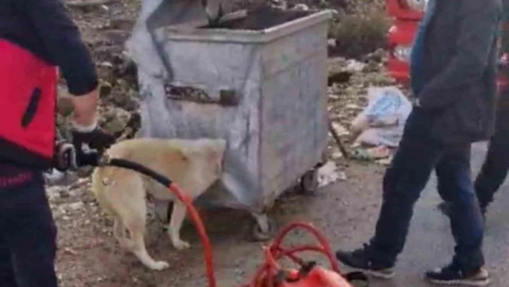 Kafası çöp konteynerine sıkışan köpek kurtarıldı