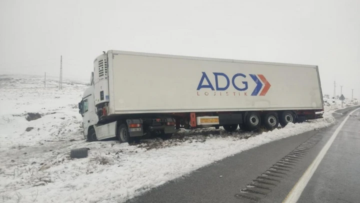 Van'ın Çaldıran ilçesinde kar yağışı ve buzlanmadan dolayı tır yoldan çıktı.