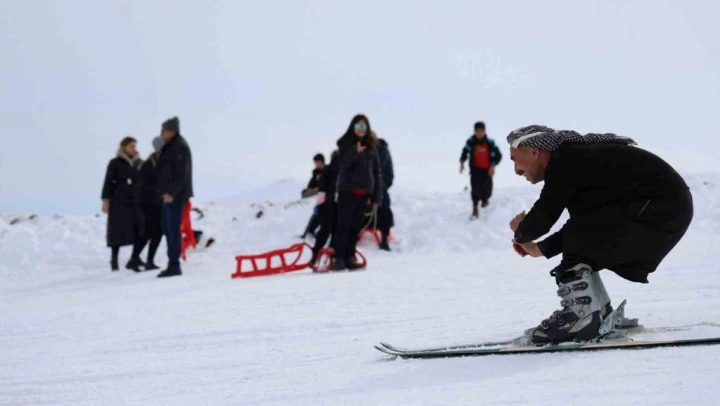 Güneydoğu Anadolu Bölgesi'nin tek kayak merkezi konumundaki Karacadağ Kayak Merkezi'ne gelen yöre halkı, şalvar ve fistan giyerek karda kaymanın keyfini çıkartıyor.