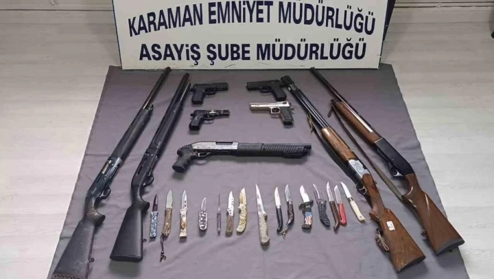 Karaman İl Emniyet Müdürlüğü'nün asayiş uygulamalarında uyuşturucu ve ruhsatsız silahlar ele geçirilirken, yakalanan 12 aranan şahıs tutuklandı.