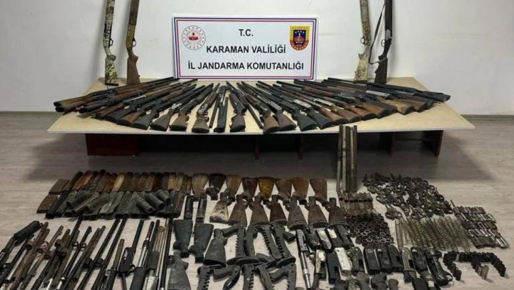 Karaman'da jandarma ekipleri tarafından yapılan denetimlerde, 30 adet ruhsatsız tüfek, 3 adet havalı tüfek ve tüfek yapımında kullanılan 343 adet çeşitli tüfek parçası ele geçirilirken, çeşitli suçlardan aranan 12 şahıs yakalandı.