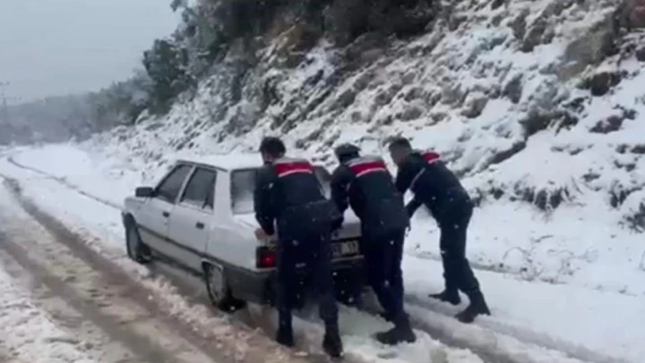 Mersin'in Erdemli ilçesinde kar yağışı nedeniyle yolda kalanların yardımına karayolları ile jandarma ekipleri yetişti. Jandarma personelleri karda kalan bazı araçları iteleyerek kurtardı.