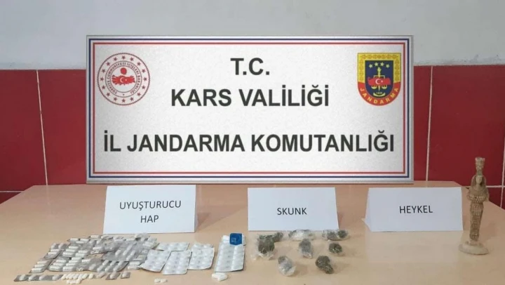 Kars'ta jandarma ekiplerince yapılan uygulamalarda uyuşturucu madde ve tarihi eser olarak değerlendirilen 1 heykel ele geçirildi.