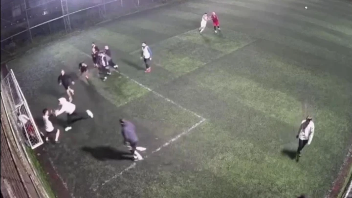 Kartal'da halı saha maçında yapılan faul sonrası iki takım oyuncuları birbirine girdi. Tekme ve yumrukların havada uçuştuğu kavga anları halı saha kamerasına yansıdı.