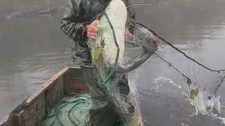 Edirne'nin Uzunköprü ilçesi Türkiye-Yunanistan sınırında akan Meriç Nehri'nde kurdukları ağlara takılan dev yayın balıklarını gören balıkçılar, yaşadıkları hayret dolu anları cep telefonuna kaydetti.