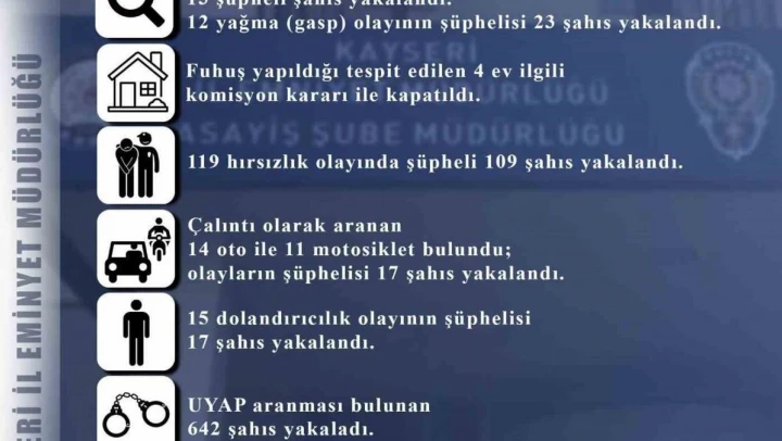 Kayseri İl Emniyet Müdürlüğü Asayiş Şube Müdürlüğü ekipleri tarafından 01-30 Kasım tarihleri arasında yapılan çalışmalarda 119 hırsızlık olayının şüphelisi 109 şahıs yakalanırken, çalıntı olarak aranan 14 oto ve 11 motosiklet de bulundu, olayların hırsızlık şüphelisi 17 şahıs da yakalandı. Yine ekipler tarafından yapılan çalışmalarda fuhuş yapıldığı tespit edilen 4 ev de ilgili komisyon kararı ile kapatıldı.