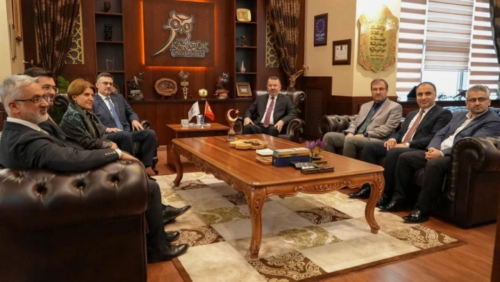 KBÜ Rektörlük makamında görüşmede KBÜ rektör yardımcıları Prof. Dr. Hasan Solmaz, Prof. Dr. Elif Çepni ve Prof. Dr. İsmail Rakıp Karaş, Genel Sekreter Lütfü Köm hazır bulundu.