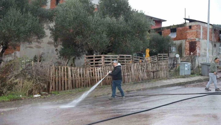 Körfez'de yoğun yağış sonrası çamurla kaplanan cadde ve sokaklar ekipler tarafından yıkanarak temizlendi.