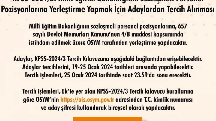ÖSYM Başkanlığı'ndan yapılan açıklamada, Milli Eğitim Bakanlığının sözleşmeli personel pozisyonlarına 657 sayılı Devlet Memurları Kanunu'nun 4/B maddesi çerçevesinde istihdam edilmek üzere yerleştirme yapılacağını bildirdi. Adayların tercihlerini 19-25 Ocak tarihleri arasında yapabileceği belirtilen açıklamada, 'Tercih işlemleri, 19 Ocak tarihinde saat 10.00'da başlayacak ve 25 Ocak tarihinde saat 23.59'da sona erecektir. Tercih işlemleri, Ek'te yer alan alan KPSS-2024/3 tercih kılavuzu kurallarına göre ÖSYM'nin 'https://ais.osym.gov.tr' adresinden T.C. kimlik numarası ve aday şifresi kullanılarak bireysel olarak yapılacaktır. Adayların tercih işlemleri için kılavuzu dikkatle incelemeleri gerekmektedir' denildi.
