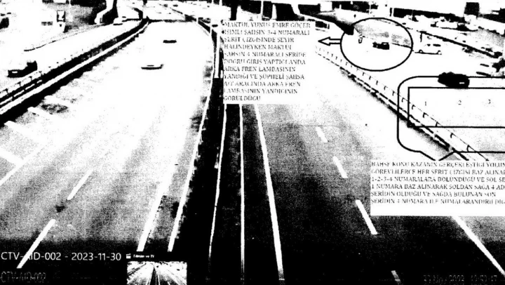 Görüntü inceleme tutanağında ayrıca, çarpışma anı sonrasında şüphelinin aracına ait arka fren lambalarının yanmadığı ve 3 numara ile adlandırılan şeride doğru seyir halinde olduğunun görüldüğü aktarıldı.
