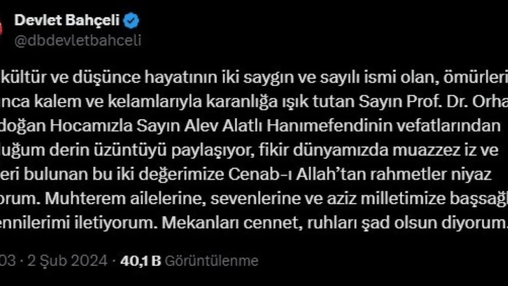 MHP Genel Başkanı Devlet Bahçeli, sosyal medya hesabından yaptığı açıklamada, 'Türk kültür ve düşünce hayatının iki saygın ve sayılı ismi olan, ömürleri boyunca kalem ve kelamlarıyla karanlığa ışık tutan Prof. Dr. Orhan Türkdoğan Hocamızla Alev Alatlı Hanımefendinin vefatlarından duyduğum derin üzüntüyü paylaşıyor, fikir dünyamızda muazzez iz ve eserleri bulunan bu iki değerimize Cenab-ı Allah'tan rahmetler niyaz ediyorum. Muhterem ailelerine, sevenlerine ve aziz milletimize başsağlığı temennilerimi iletiyorum. Mekanları cennet, ruhları şad olsun diyorum' ifadelerine yer verdi.