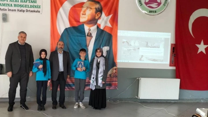 Manisa'nın Sarıgöl ilçesindeki Mustafa Metin İmam Hatip Ortaokulu bünyesinde düzenlenen 'Mübarek üç ayların önemi ve Kudüs' konulu seminerin sonunda ilk dönem karnelerine göre 5 ve 6. sınıflarda birinci olan öğrencilere Kur'an-ı Kerim hediye edildi.
