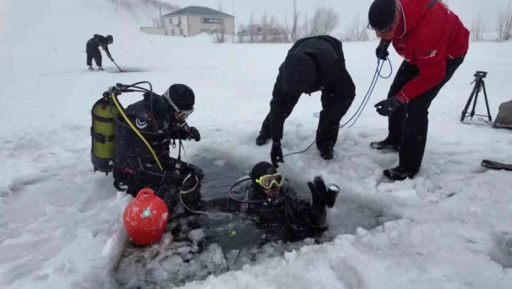 On beş dakika içeride kaldıklarını söyleyen Dalış eğitmeni Kadir Erekinci, 'On dört nokta küsur. Derinlik olarak da on beş dakika içeride kaldım. Derinlik olarak da en derin yeri yedi buçuk metre Derinliğinde. burada derinlik çok önemli değil. Çünkü bizim altta işimiz yok. Buzun altı önemli ve bir giriş noktasından, diğer çıkış noktasına ulaşmak önemli. Bunun için alınan emniyetler sağ olsun elliler üç bin iki yüz firması bize bu konuda çok büyük destekler sağladı. Araba kurtarma ekibi. Arama kurtarma ekipleri bize destek burada. Yine belediyemizin ejder üç bin iki yüzün destekleri sayesinde bu gerçekleşti. Ama şunu da söylemek gerekiyor. Yani bu basit malzemelerle, basit daha önce dalış yapmış arkadaşların tecrübesiyle olacak şey değil. Üstelik tecrübe ve üst seviye ekipman gerektiren Bir dalış çeşidi. Tabii irtifada dalış yapıyoruz. Bu ayrı bir ekstra. Hem de buz altına da alıyoruz. Bu da ayrı bir ekstra' şeklinde konuştu.