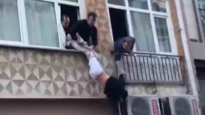 Pendik'te elleri kelepçeli halde götürüldüğü hastaneden kaçan şahıs bir eve saklandı. Ev sahibinin polise ihbarı üzerine şahıs camdan sarkarak kaçmaya çalışırken, polislerin ve vatandaşların bacaklarından tutmasıyla camda asılı kaldı. Korku dolu o anlar cep telefonu kamerasına yansıdı.