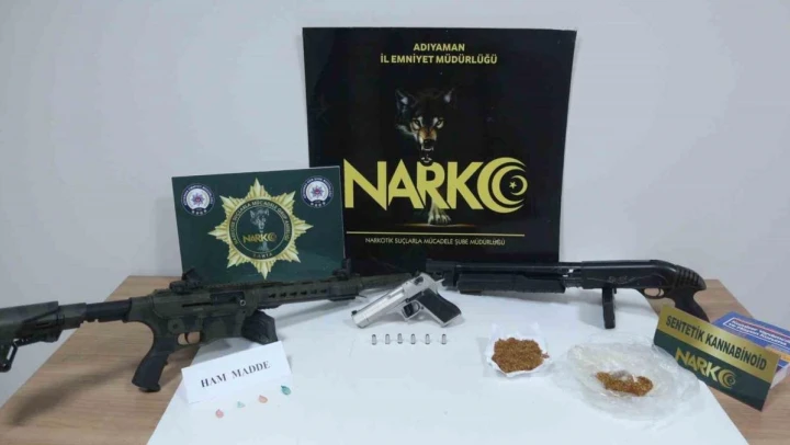 Kahta ilçesinde Cumhuriyet ve Gazi Mahallesinde 2 ayrı adreste arama gerçekleştirildi. B.H.Ç, S.N.S, E.A ve M.S. isimli şahısların gözaltına alındığı arama 1.98 gram sentetik kannobinoid hammaddesi, 54.76 gram sentetik kannobinoid maddesi, 1 adet kuru sıkı tabanca ve 2 adet pompalı tüfek, 1 adet şarjör ele geçirildi.