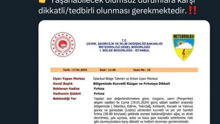 Meteoroloji Genel Müdürlüğü'nden elde edilen bilgilerin neticesinde Sakarya Valiliği, sosyal medya hesabı üzerinden yarın akşam ile Cuma günü sabah saatleri arasında etkili olması beklenen kuvvetli fırtınaya karşı vatandaşları uyardı. Yaşanabilecek olumsuz durumlara karşı Valiliğin sosyal medya hesabından yapılan paylaşımda, 'Yapılan son değerlendirmelere göre; rüzgarın, yarın (Perşembe) akşam saatleri ile Cuma (19.01.2024) günü sabah saatleri arasında bölgemizde güney ve güneybatı yönlerden kuvvetli ve yer yer hamleli fırtına (50-80 km/saat) şeklinde esmesi beklendiğinden ağaç ve direk devrilmesi, çatı uçması, soba ve baca gazı kaynaklı zehirlenme riski gibi olumsuzluklara karşı dikkatli ve tedbirli olunması gerekmektedir' denildi.