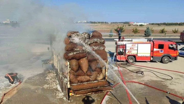 Şanlıurfa'da seyir halindeki pamuk yüklü kamyonda çıkan yangını itfaiye ekipleri söndürdü.