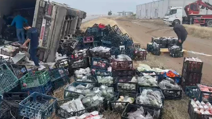 Sebze ve meyve yüklü tır devrildi