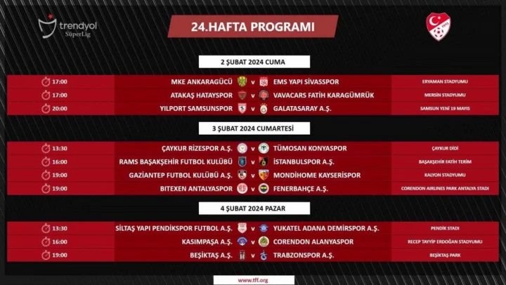 Türkiye Futbol Federasyonu, Trendyol Süper Lig'in 24 ve 25. hafta müsabaka programını duyurdu. TFF'nin resmi internet sitesinden yapılan açıklamaya göre Süper Lig'de 24 ve 25. haftanın karşılaşma programları şu şekilde: