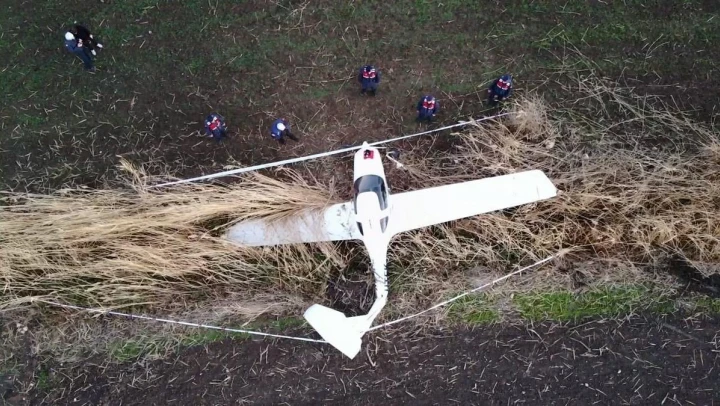 Tarlaya inen uçağın enkazı, dron ile görüntülendi