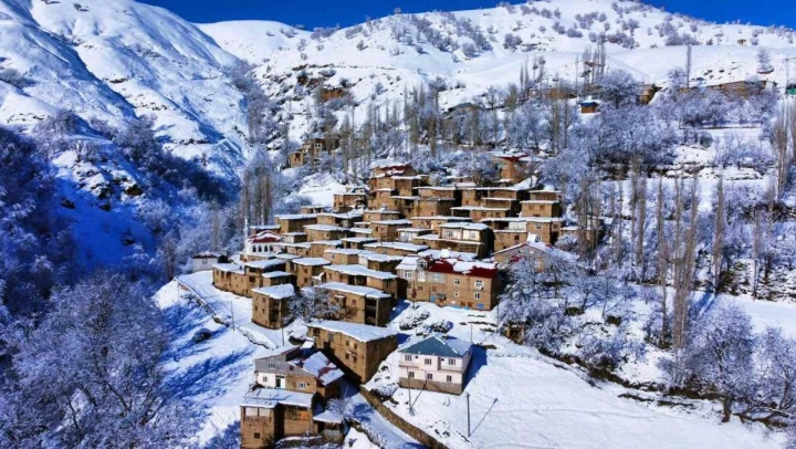 Bitlis'in Hizan ilçesindeki taş evlerden oluşan köyler, kış mevsimiyle birlikte kartpostallık manzaralar oluşturuyor.
