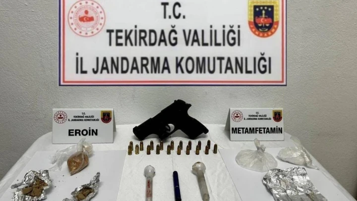 Çorlu Önerler Mahallesi'nde durdurulan araç içerisinde bulunan M.A., A.Ö., M.Ö. ve N.Ç. isimli şahısların yapılan aramasında 1 adet 7*65 mm çapında ruhsatsız tabanca, 1 adet şarjör, 19 adet tabanca fişeği, 50 gram metamfetamin, 32 gram eroin, 3 uyuşturucu madde kullanma aparatı ele geçirildi.