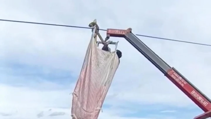 Nevşehir'de telefon direğinde mahsur kalan kedi, iş makinası yardımıyla köylüler tarafından kurtarıldı.