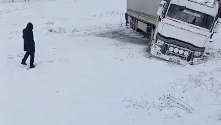 TIR sürücü Yeniköy istikametinde her şeyden habersiz giderken sabaha karşı yağan karında etkisiyle yoldan kaydı. Kendi uğraşları ile çıkmaya çalışsa da köylere gidiş ve dönüş yolunu da tamamı ile kapattı.