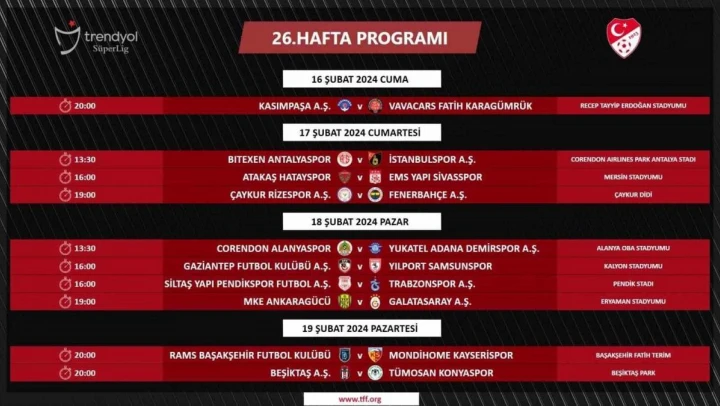 Türkiye Futbol Federasyonu'nun (TFF) resmi internet sitesinden yapılan açıklamada, Süper Lig'in 26. haftasında oynanacak müsabakaların günleri belli oldu. 16-19 Şubat tarihleri arasında yapılacak karşılaşmaların programı şöyle: