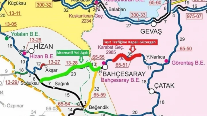 Bahçesaray Kaymakamlığı sosyal medya hesabından yaptığı paylaşımda, 'Karayolları ekiplerince yoğun kar yağışı ve tipi nedeniyle görüş mesafesi tehlike teşkil edecek duruma gelmiştir. Bundan dolayı Bahçesaray ilçesine bağlı Liman Mahallesi ile Çatak ilçesine bağlı Yukarı Narlıca Mahallesi güzergahı 16.30'da geçici olarak çift yönlü trafiğe kapatılmıştır' denildi.