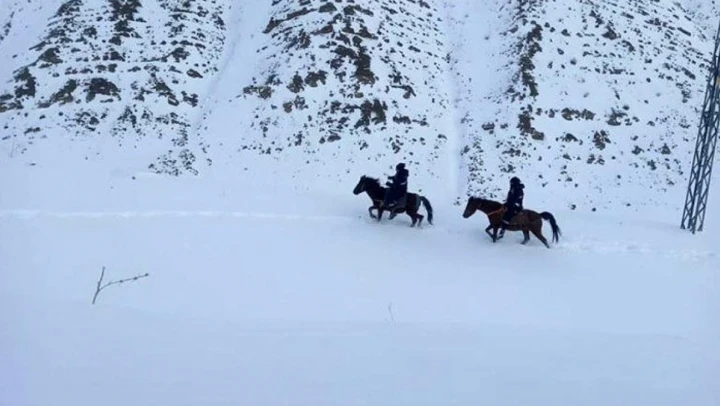 Soğuk havada atlarla dik dağlarda ilerlemekte zorlanan ekipler, bir süre sonra olumsuz hava şartlarına rağmen direkteki hatta oluşan arızayı onardı.