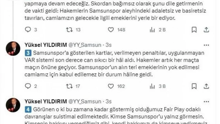 SAMSUN (İHA) – Y. Samsunspor ve Başkan Yüksel Yıldırım, yazılı açıklama ile hakem hatalarına tepki göstererek, adalet vurgusu yaptı.