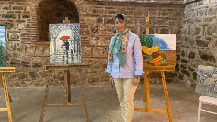 Bilecik'in Gölpazarı ilçesinde yağlı boya resimleri tarihi Taşhan binasında sergilenirken, sergiye büyük ilgi oldu.