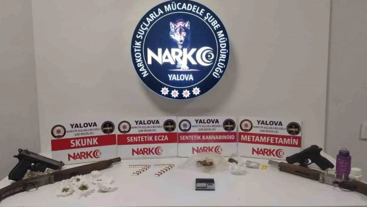 Alınan bilgiye göre, Yalova İl Emniyet Müdürlüğü Narkotik Suçlarla Mücadele Şubesi ekipleri, E.G'nin iş yeri ve yakın bölgesinde uyuşturucu ticareti yaptığı bilgisine ulaştı. Yapılan operasyonda E.G., F.A. ve E.K. gözaltına alındı. Şüphelinin iş yerinde yapılan aramada 59 sentetik ecza tablet hap, 17,51 gram sentetik kannabinoid, 6,50 gram skunk, 185 gram çözücü kimyasal madde, hassas terazi, 2 adet yarı otomatik av tüfeği, tabanca, 6 tabanca fişeği ve kuru sıkı tabanca ele geçirildi. E.G. emniyetteki işlemlerinin ardından sevk edildiği mahkemece tutuklanarak cezaevine gönderilirken, diğer 2 şüpheli hakkında ise kullanmak için uyuşturucu madde satın almak suçundan işlem yapıldı.