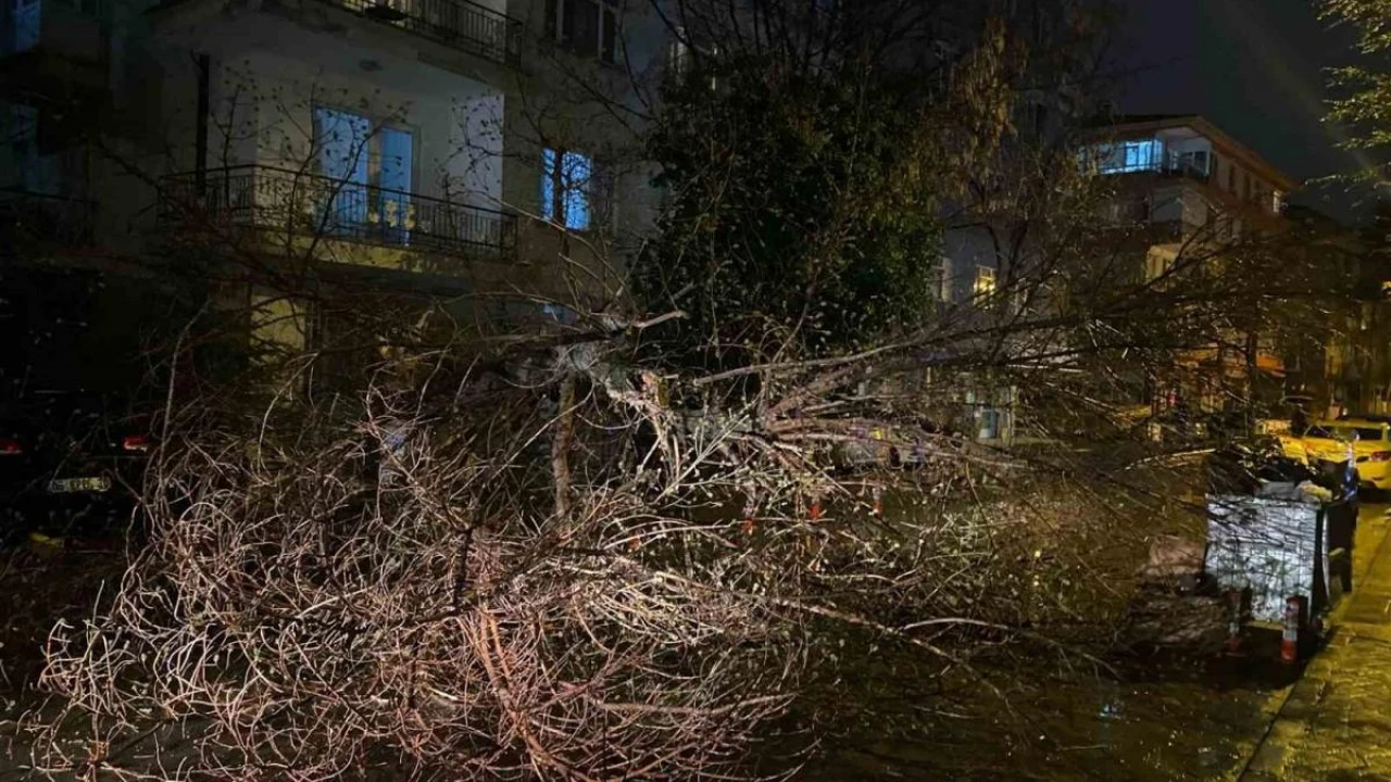 Ankara'da etkili fırtına nedeniyle ağaç devrilirken, sokak geçici olarak trafiğe kapatıldı.